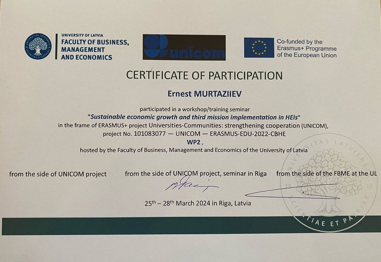 З 25 по 28 березня 2024 року в рамках проєкту Erasmus + “Universities-Communities: strengthening cooperation”, що реалізується за співфінансування Європейського Союзу, на базі факультету бізнесу, менеджменту та економіки Університету Латвії відбувся Міжнародний тренінговий семінар “Sustainable economic growth and third mission implementation in HEIs”.