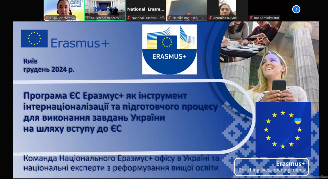 10 грудня 2024 року проректор з наукової, інноваційної роботи та міжнародної співпраці Лариса Полякова та начальниця відділу міжнародних зв’язків та проєктної діяльності Ольга Гончарова протягом дня брали участь у семінарі МОН України щодо проєктів Еразмус+. Порядок денний семінару включав питання, які стосуються національних пріоритетів та участі МОН України в проєктах Еразмус+; особливостей реалізації проєктів Міжнародної технічної допомоги ЄС в Україні: реєстрація, моніторинг, звітування; стану виконання Дорожньої карти європейської інтеграції у сферах освіти та науки на 2024- 2027 рр.; загального огляду можливостей для університетів конкурсів 2025 р. Програми ЄС Еразмус+ у сфері освіти, молоді та спорту для Україн, Інституційна спроможність впровадження проєктів Програми Еразмус+.