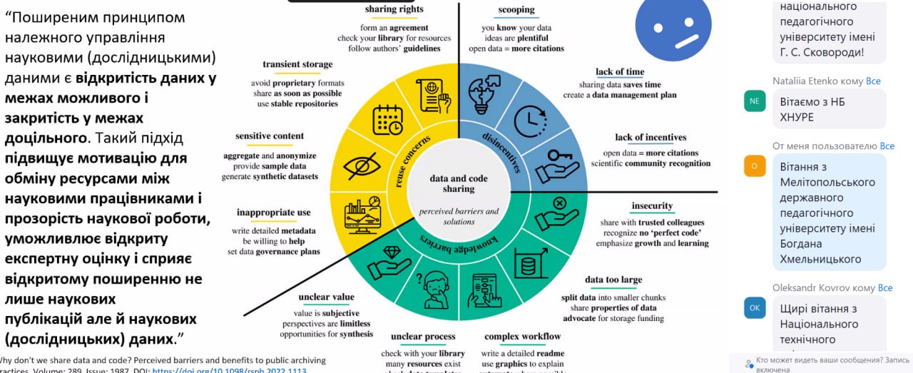 5 березня 2025 року начальник відділу міжнародних зв’язків та проєктної діяльності та заступники деканів з наукової роботи та міжнародного співробітництва Мелітопольського державного педагогічного університету імені Богдана Хмельницького відвідали вебінар «Відкритий доступ, відкрита наука, відкриті дані: виклики часу», який проходив в рамках Міжнародного Дня відкритих даних. Учасники вебінару ознайомилися з найкращими європейськими практиками збору та аналізу дослідницьких даних, технологічним досвідом впровадження та використання відкритих даних та штучного інтелекту.