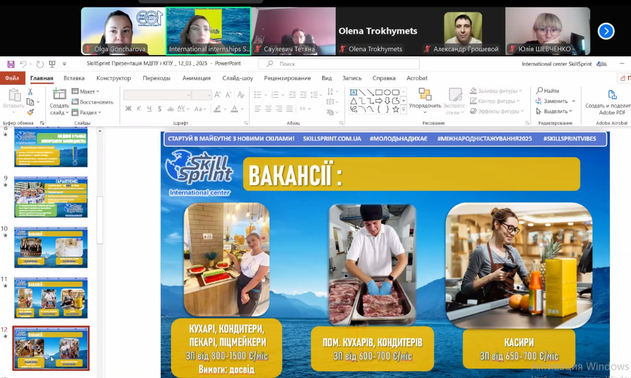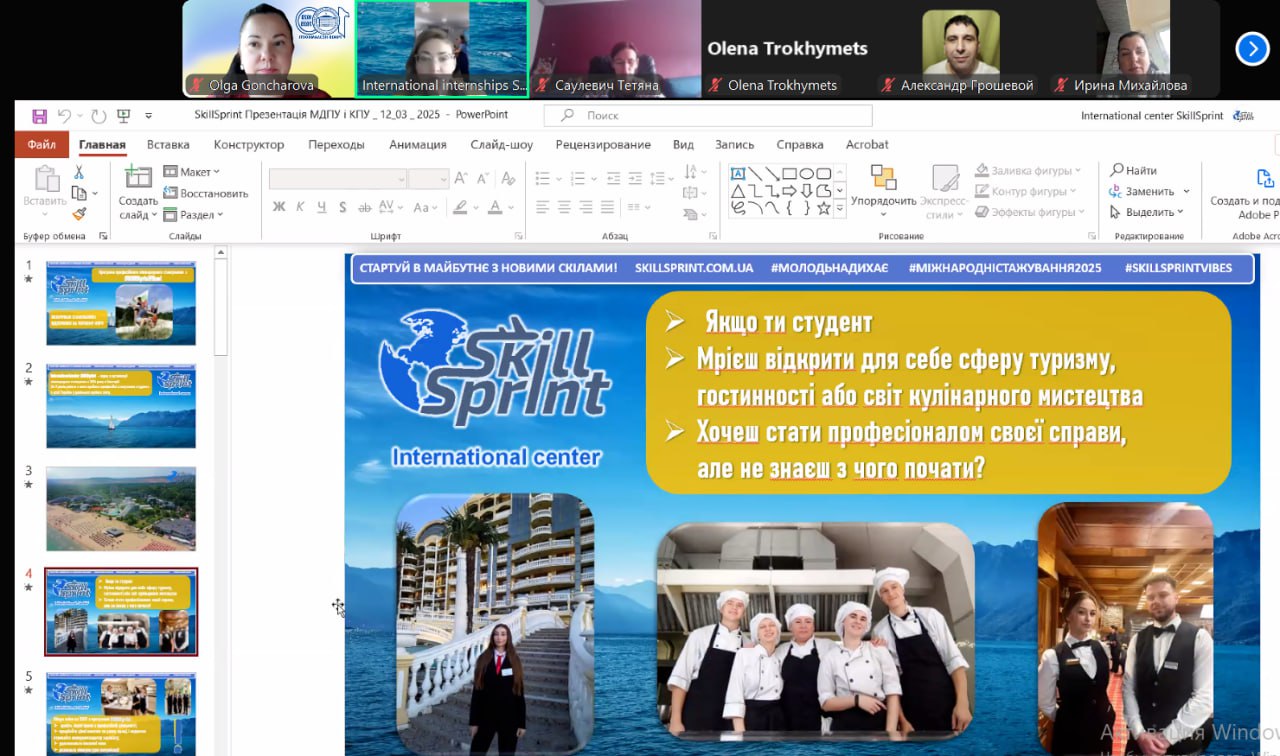 12 березня 2025 року відбувалася зустріч здобувачів вищої освіти Мелітопольського державного педагогічного університету імені Богдана Хмельницького з компанією SkillSprint, з якою наш Університет має договір про співпрацю. На зустрічі було представлено інформацію про літні стажування в Болгарії, які надають можливість прокачати свої навички в професійному середовищі та стартувати у новій професії впевнено.