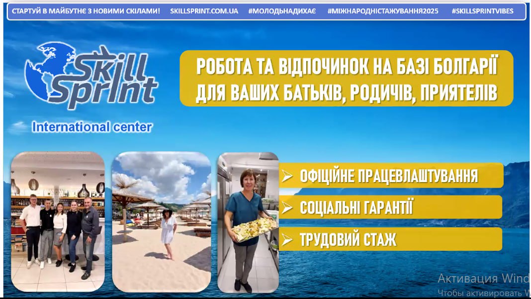 Серед вакансій, які пропонує компанія SkillSprint, адміністратори (англійська мова В1-В2), офіціанти, бармени, касири, супервайзери, кухарі, кондитери, помічники кухарів, кондитерів, масажисти, аніматори (англійська мова В1).