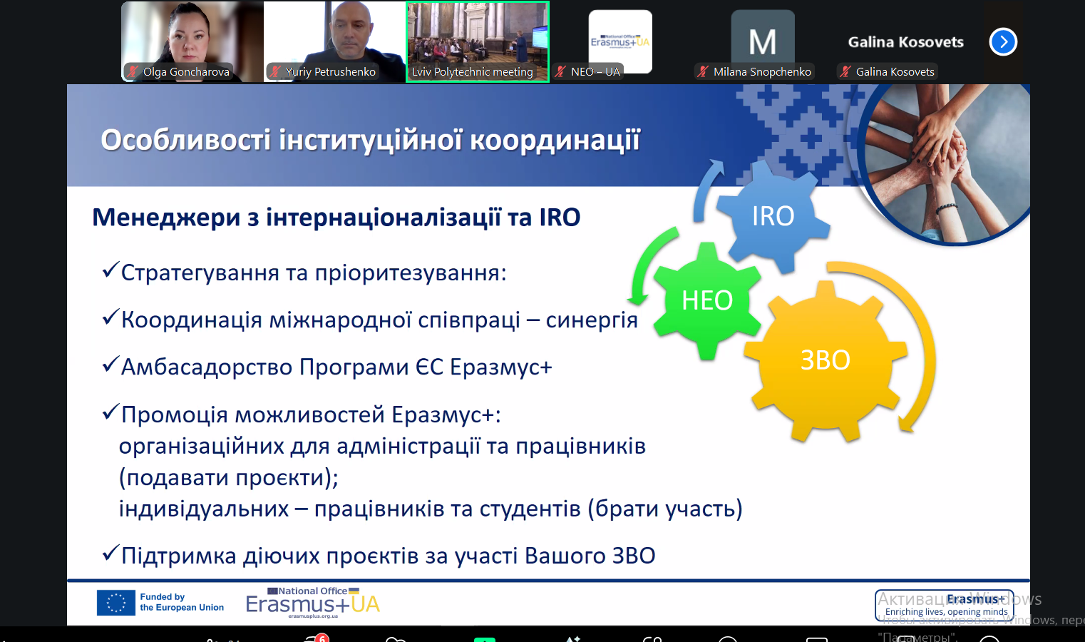 12 грудня 2025 року відбувся «Регіональний тренінг для працівників міжнародних відділів, керівників, відповідальних за міжнародну співпрацю, інституційних координаторів Еразмус+ закладів вищої освіти України», який завершив цикл заходів в рамках Інформаційних днів ЕРАЗМУС+. Тренінг проходив у гібридному форматі, МДПУ імені Богдана Хмельницького представляла начальник відділу міжнародних зв’язків та проєктної діяльності Ольга ГОНЧАРОВА. На початку заходу з вітальним словом до пристуніх звернулася Світлана ШИТІКОВА, координаторка Національного Еразмус+ офісу в Україні. В ході тренінгу представники університетів розглянули особливості інституційної координації проєктів Еразмус+; дослідили можливості та результати конкурсів, міжнародні професійні мережі та заходи; проаналізували особливості візуалізації та розповсюдження інформації про діяльність та результати проєктів; дізналися про те, як активізувати співпрацю з партнерами та забезпечити якість проєктної діяльності.