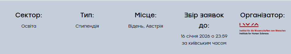 - Можливість три місяці працювати над своєю науковою роботою в Інституті гуманітарних досліджень Відня — з вересня 2026 року по червень 2027 року.