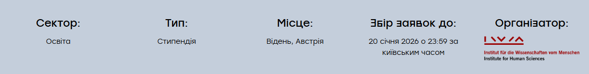 - Можливість три місяці працювати над своєю науковою роботою в Інституті гуманітарних досліджень Відня — з вересня по грудень 2026 року.