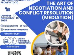 У рамках реалізації проєкту Еразмус + віртуальна мобільність «Мистецтво переговорів і вирішення конфліктів (медіація) / ArtNoConflict» запрошуємо молодь Ваших освітніх установ на онлайн сертифікований курс «The art of negotiation and conflict resolution (MEDIATION)».