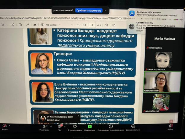 Метою вебінару стало висвітлення ролі психолога у формуванні психологічної стійкості університетської спільноти, а також обмін практичним досвідом роботи з ресурсними станами, організації груп підтримки та інтервізійної діяльності. Учасники мали можливість ознайомитися з ефективними інструментами фасилітації групової взаємодії, спрямованими на стабілізацію емоційного стану та підвищення резильєнтності в умовах кризових викликів.