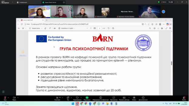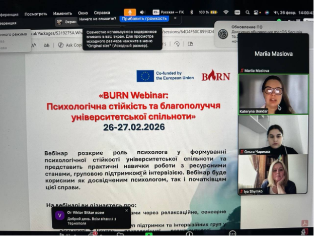 26-27 лютого 2026 року в рамках реалізації Міжнародного проєкту ERASMUS+ «Boosting university psychological resilience and wellbeing in (post-) war Ukrainian nation» (Посилення психологічної стійкості і благополуччя університетів у (після)воєнній Україні) (Грантова угода 101129379) відбувся міжнародний BURN-вебінар «Психологічна стійкість та благополуччя університетської спільноти», присвячений актуальним питанням підтримки психічного здоров’я в освітньому середовищі. Захід об’єднав науковців, психологів, викладачів і фахівців центрів психологічної підтримки українських університетів.