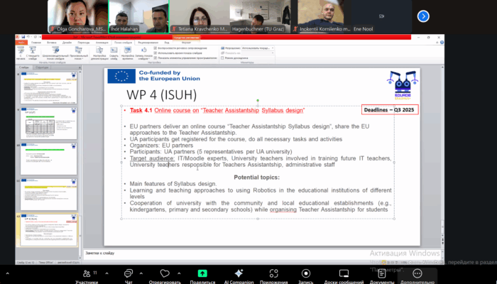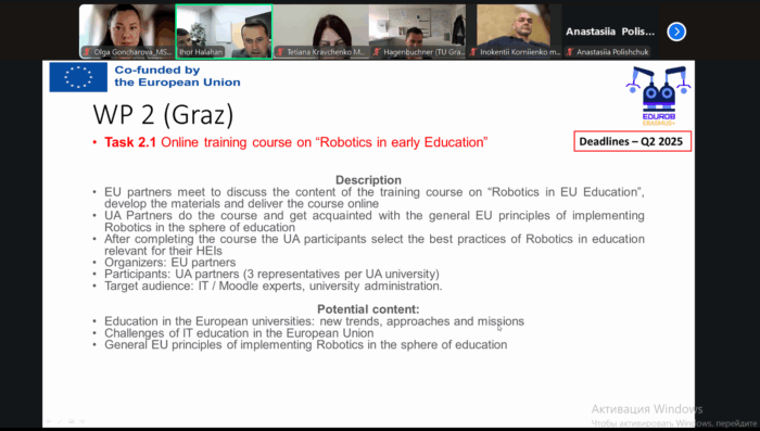 On October 30, 2025, a scheduled meeting of partner universities of the International ERASMUS+ Project “Developing Future Educators’ Digital Competence Through Introducing Robotics into Curriculum” (Grant Agreement No. 101179514 – EduRob) took place. At the meeting, the partners discussed the results of the project implementation during the first three quarters, clarified the details of the online courses of package 2, and also outlined the next priority steps for the implementation of work packages 2-4. It should be noted that the ERASMUS+ Project “Developing Future Educators’ Digital Competence Through Introducing Robotics into Curriculum” is of great importance for the modernization of pedagogical education and improving the quality of future teachers’ training. Its implementation contributes to the formation of future teachers’ digital and technological competencies necessary for effective teaching in a modern educational environment that is increasingly focused on technological innovations. The project opens up new opportunities for international cooperation, exchange of experience, and the introduction of robotics into curricula, which is an important step towards integrating Ukrainian education into the European educational space and increasing its competitiveness.