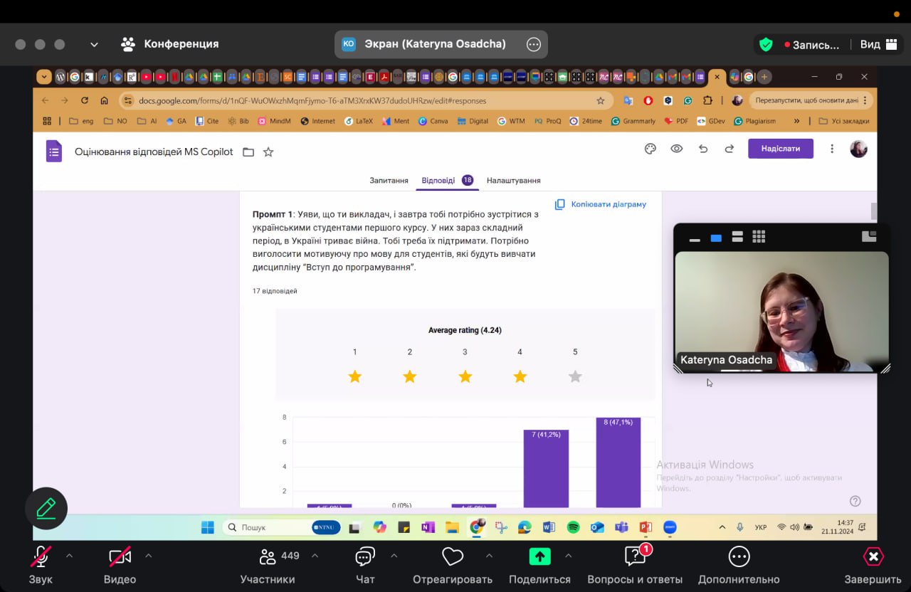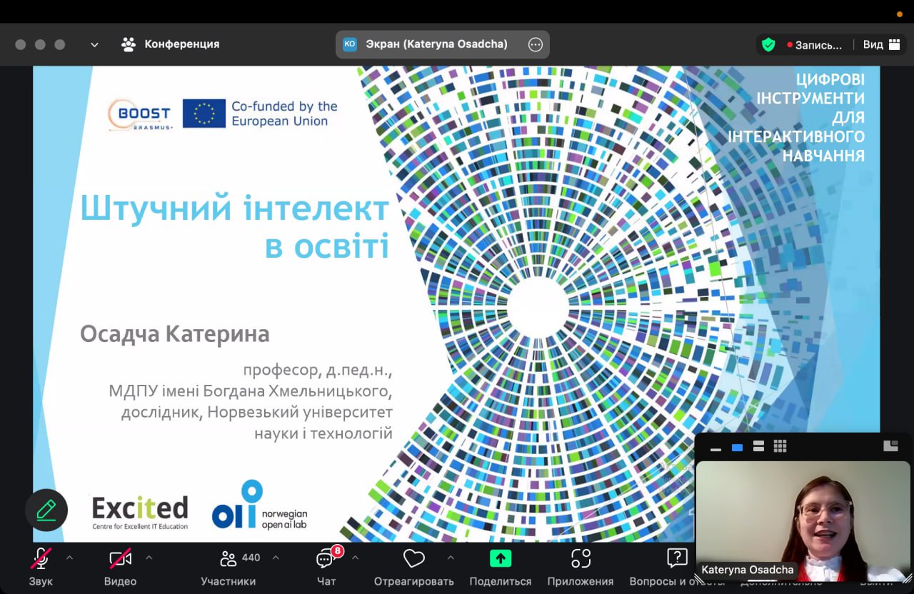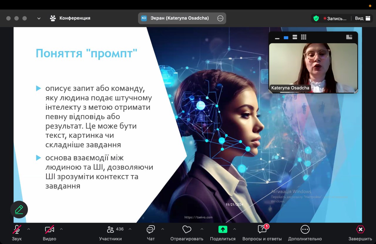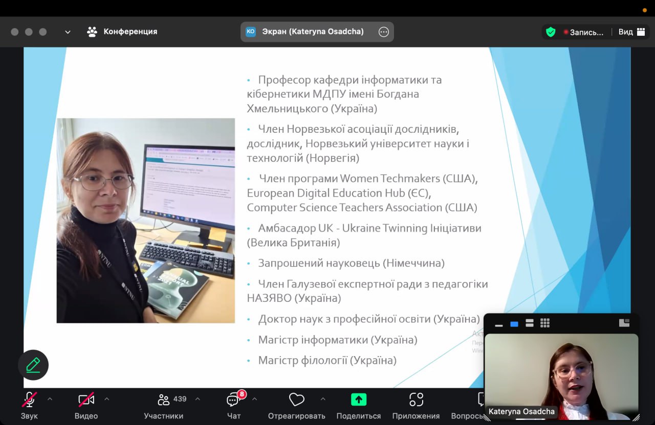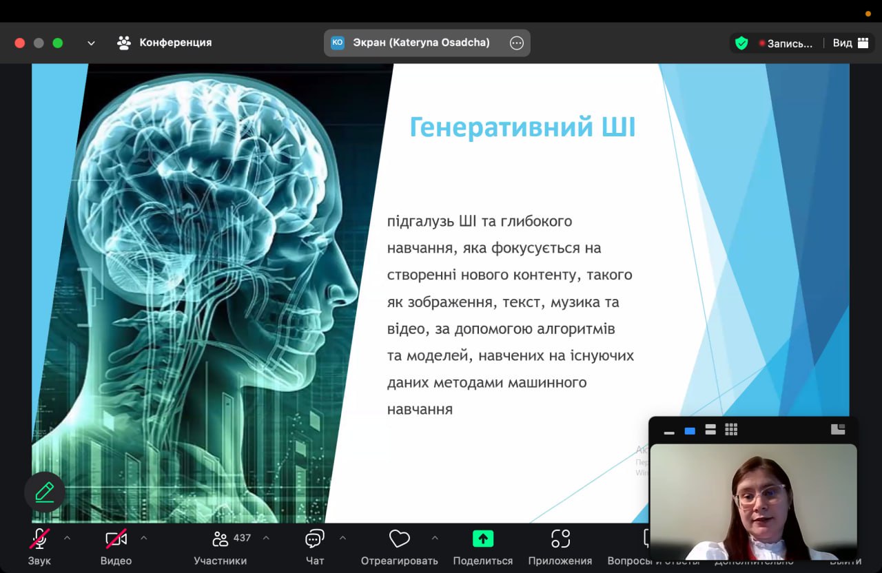 В межах конференційних заходів 21.11.24 успішно пройшла лекція Катерини Осадчої, професорки кафедри інформатики і кібернетики МДПУ імені Богдана Хмельницького, «Штучний інтелект в освіті».