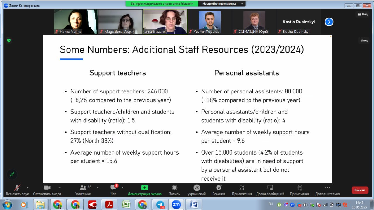 16 травня 2025 року у форматі онлайн відбувся міжнародний семінар «Support and Inclusion in Regular Education», організований у межах проєкту Enhancing the Participation and Ensuring the Right to Education for Children with Intellectual Disability: Developing Capacities and Opportunities (EPERE), № 00787/2024. Захід був присвячений сучасним підходам до інклюзивної освіти у закладах загальної середньої освіти.