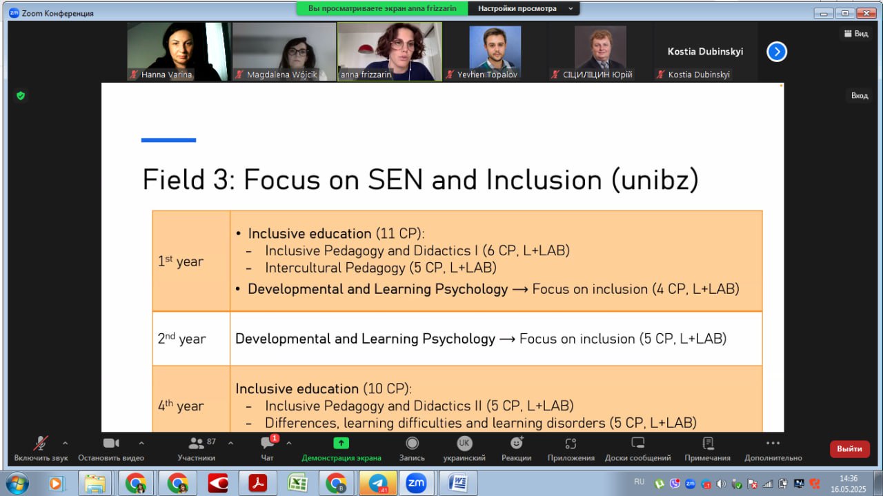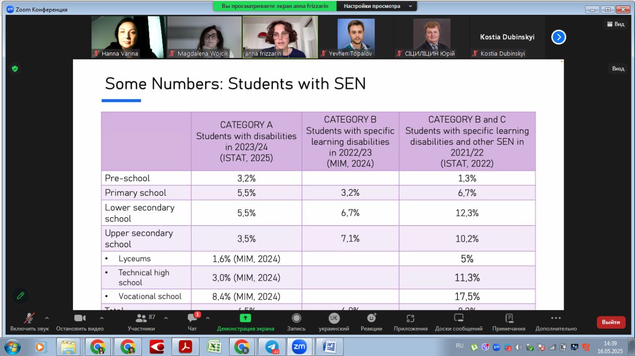 The first presentation was delivered by Dr. Anna Frizzarin (Free University of Bozen-Bolzano, Italy), who shared Italy’s experience in implementing inclusive education. The presentation provided a detailed overview of support mechanisms for students with special educational needs, including collaboration among teachers, teaching assistants, families, and local authorities. Special emphasis was placed on the legal foundations of inclusion in Italy and the role of institutional support within the education system.