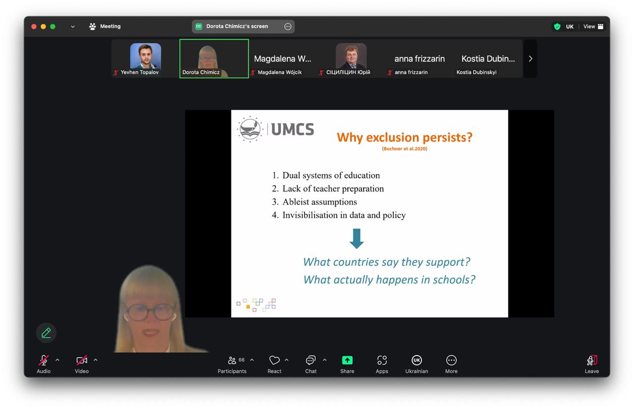 Наступну доповідь представила Dorota Chimicz (Maria Curie-Skłodowska University, Poland), яка зосередилася на концепції універсального дизайну навчання (Universal Design for Learning, UDL) як рамкової моделі створення інклюзивного освітнього середовища. Доповідачка окреслила ключові принципи UDL, що передбачають варіативність у поданні навчального матеріалу, способах демонстрації результатів навчання та залученні учнів до освітнього процесу. Значну увагу було приділено практичним прикладам адаптації уроків, диференціації завдань та формуванню сприятливого емоційного клімату в класі.