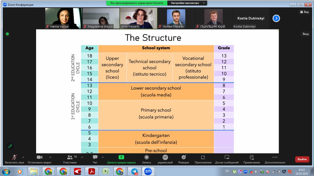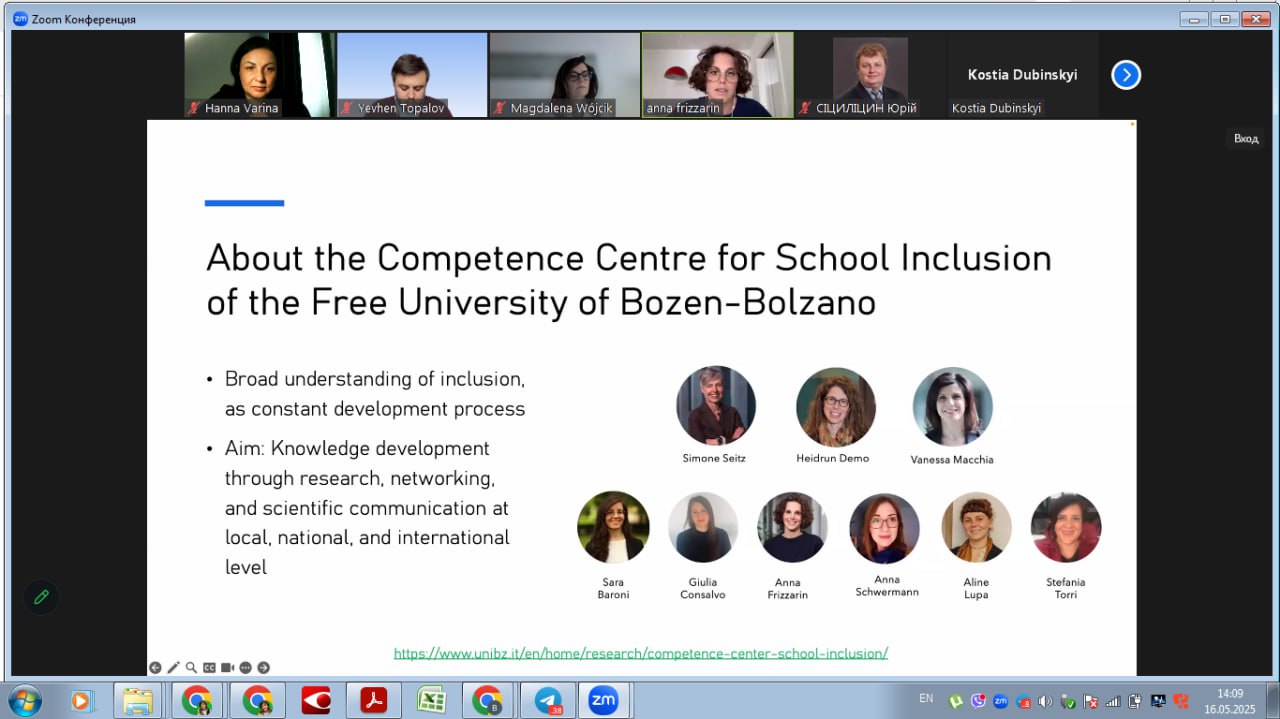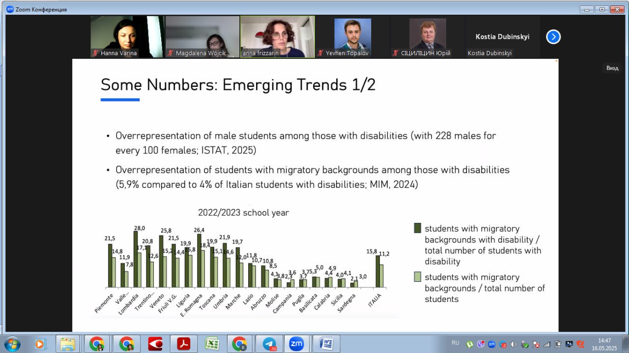 Першу доповідь представила Anna Frizzarin (Free University of Bozen-Bolzano, Italy), яка поділилася досвідом упровадження інклюзивної освіти в Італії. У доповіді було детально розглянуто механізми підтримки учнів з особливими освітніми потребами, зокрема через співпрацю між педагогами, асистентами, родинами та місцевими органами влади. Окрему увагу доповідачка приділила правовим засадам інклюзії та ролі інституційної підтримки в італійській системі освіти.