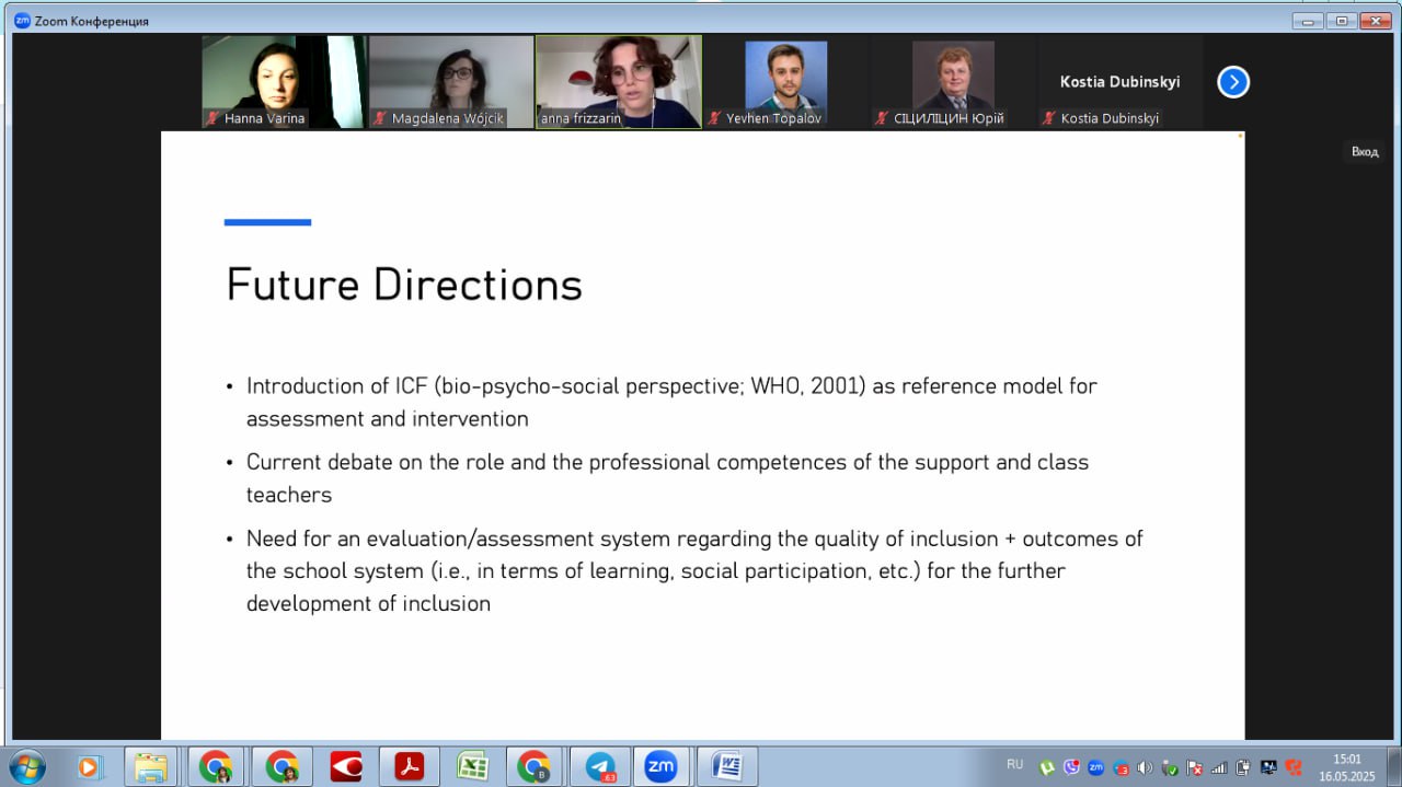 The first presentation was delivered by Dr. Anna Frizzarin (Free University of Bozen-Bolzano, Italy), who shared Italy’s experience in implementing inclusive education. The presentation provided a detailed overview of support mechanisms for students with special educational needs, including collaboration among teachers, teaching assistants, families, and local authorities. Special emphasis was placed on the legal foundations of inclusion in Italy and the role of institutional support within the education system.