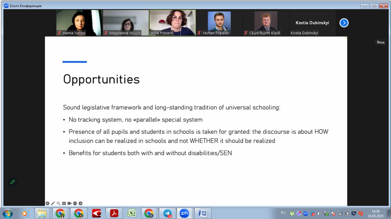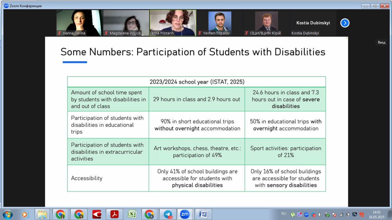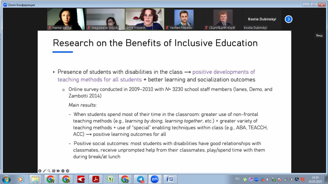 16 травня 2025 року у форматі онлайн відбувся міжнародний семінар «Support and Inclusion in Regular Education», організований у межах проєкту Enhancing the Participation and Ensuring the Right to Education for Children with Intellectual Disability: Developing Capacities and Opportunities (EPERE), № 00787/2024. Захід був присвячений сучасним підходам до інклюзивної освіти у закладах загальної середньої освіти.