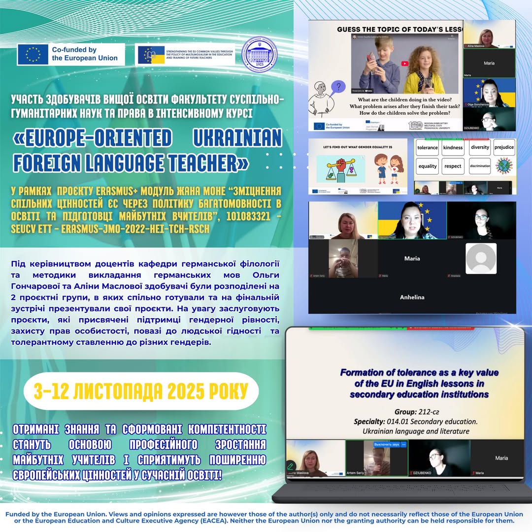 Здобувачі вищої освіти факультету суспільно-гуманітарних наук та права, залучені до проєкту Erasmus+ Модуль Жана Моне “Зміцнення спільних цінностей ЄС через політику багатомовності в освіті та підготовці майбутніх вчителів”, 101083321 – SEUCV ETT – ERASMUS-JMO-2022-HEI-TCH-RSCH, завершили участь в Інтенсивному курсі “Europe-oriented Ukrainian Foreign Language Teacher” (30 год), який тривав з 3 по 12 листопада 2025 року.