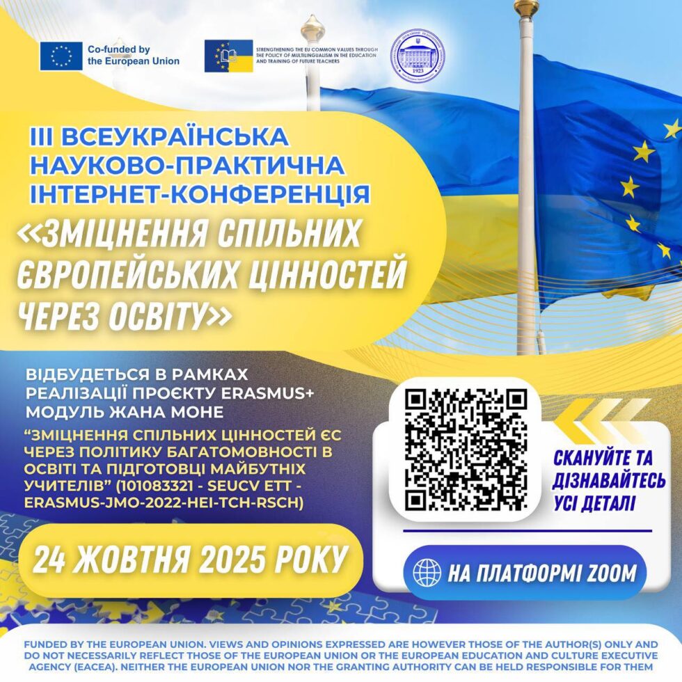 Конференція відбудеться в рамках реалізації проєкту програми Європейського Союзу Erasmus+ напряму Модуль Жана Моне “Зміцнення спільних цінностей ЄС через політику багатомовності в освіті та підготовці майбутніх вчителів” (101083321 – SEUCV ETT – ERASMUS-JMO-2022-HEI-TCH-RSCH).![]()