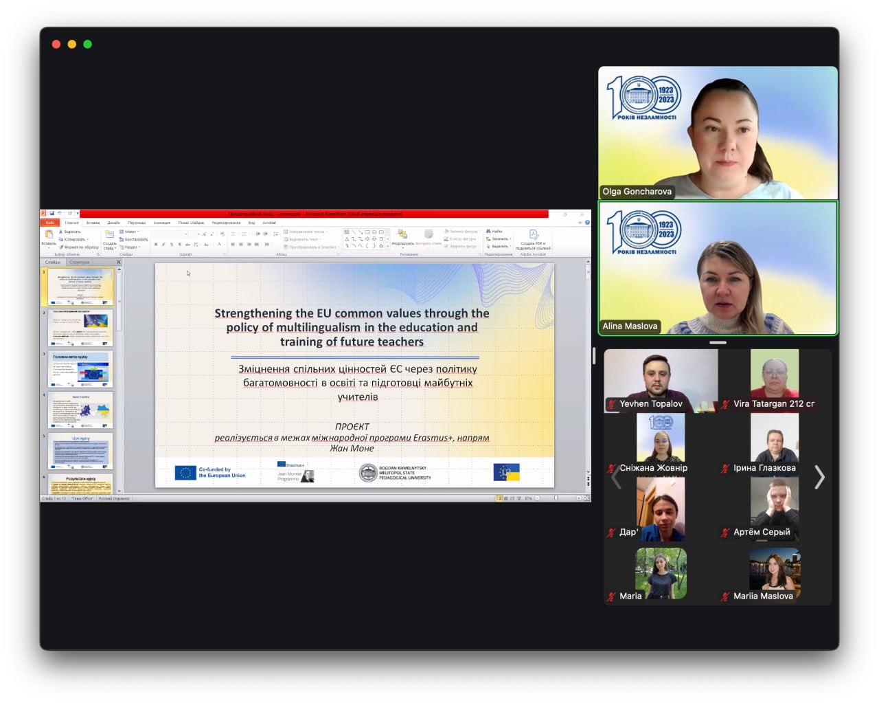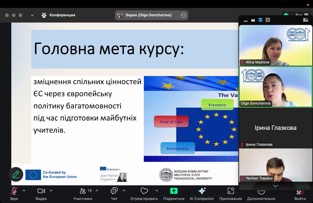 18 лютого 2025 р. на платформі Zoom пройшов захід з презентації третього циклу грантового проєкту «Зміцнення спільних цінностей ЄС через політику багатомовності в освіті та підготовці майбутніх учителів» / «Strengthening the EU common values through the policy of multilingualism in the education and training of future teachers» (101083321 — SEUCV ETT — ERASMUS-JMO-2022-HEI-TCH-RSCH) за міжнародною програмою Еразмус+ Модуль Ж. Моне. Проєкт має на меті покращення освітньо-педагогічний процесу в Україні, наближення його до європейських стандартів у сфері викладання іноземних мов, створення основи для вивчення та викладання іноземних мов з раннього віку та поширення спільних цінностей ЄС.