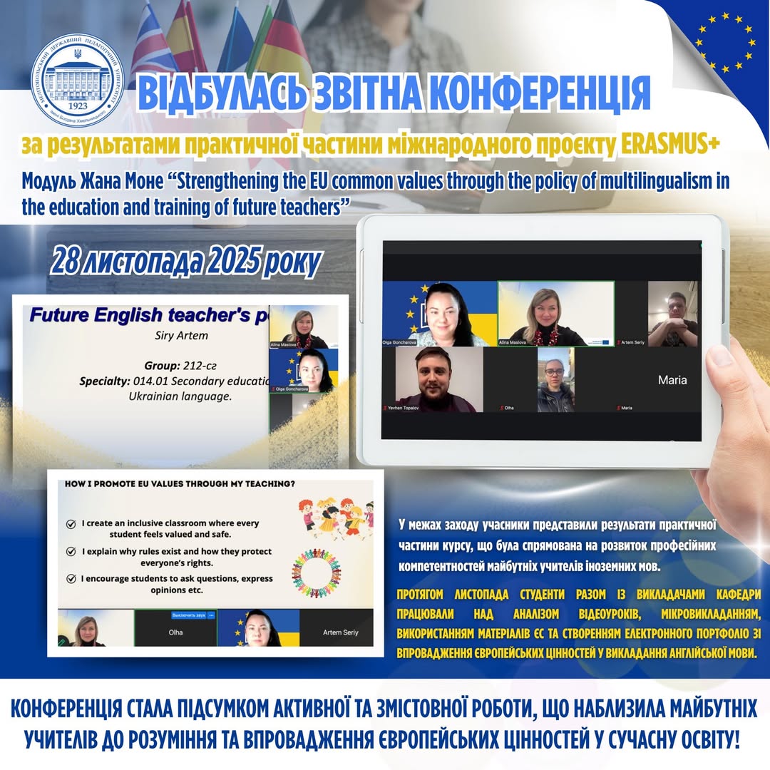 28 листопада 2025 року відбулася звітна конференція за результатами практичної частини міжнародного проєкту ERASMUS+, Модуль Жана Моне “Strengthening the EU common values through the policy of multilingualism in the education and training of future teachers” («Зміцнення спільних цінностей ЄС через політику багатомовності в освіті та підготовці майбутніх учителів») (Грантова угода 101083321).